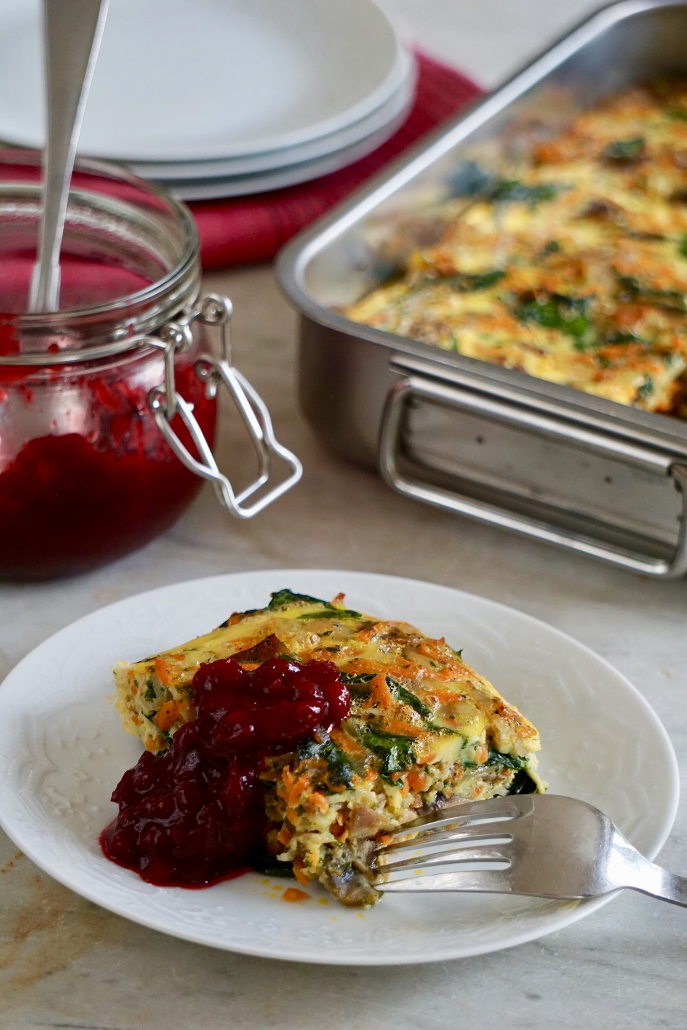 Givetvis kan man utesluta baconet och göra Frukostgratängen helt vegetarisk (pescetarian). Öka mängden med svamp istället eller tillsätt dina favoritgrönsaker och rotfrukter.