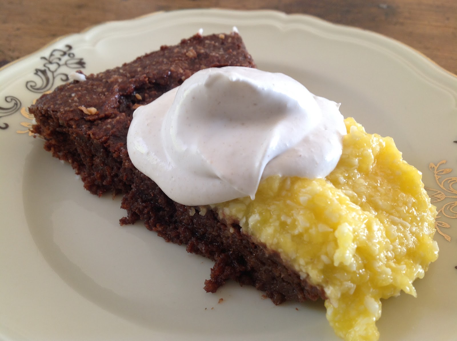 Fyllig och kladdig chokladtårta med mangokräm och ingefärsgrädde
