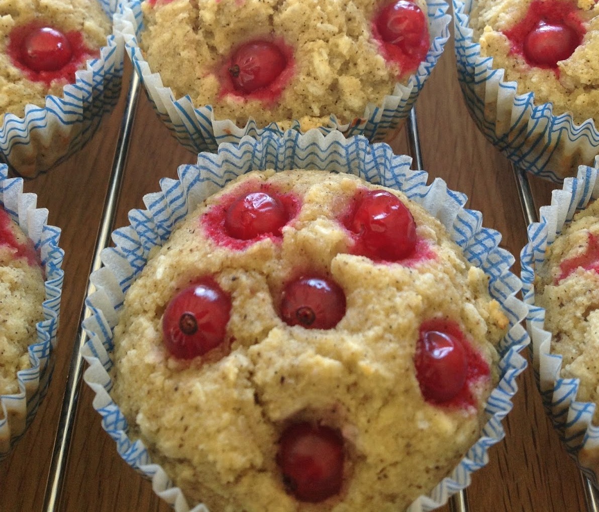 I vår trädgård har vi nu fullt med vinbär och vi äter så mycket vi orkar med. I dag så bakade jag nötfria och sockerfria muffins till kaffet och då kändes det helt rätt att trycka ner lite röda vinbär i smeten. Detta visade sig bli en mycket god och fin idé då de något sura vinbären gifte sig fint i smaken med den söta bananen, vem kunde anat!