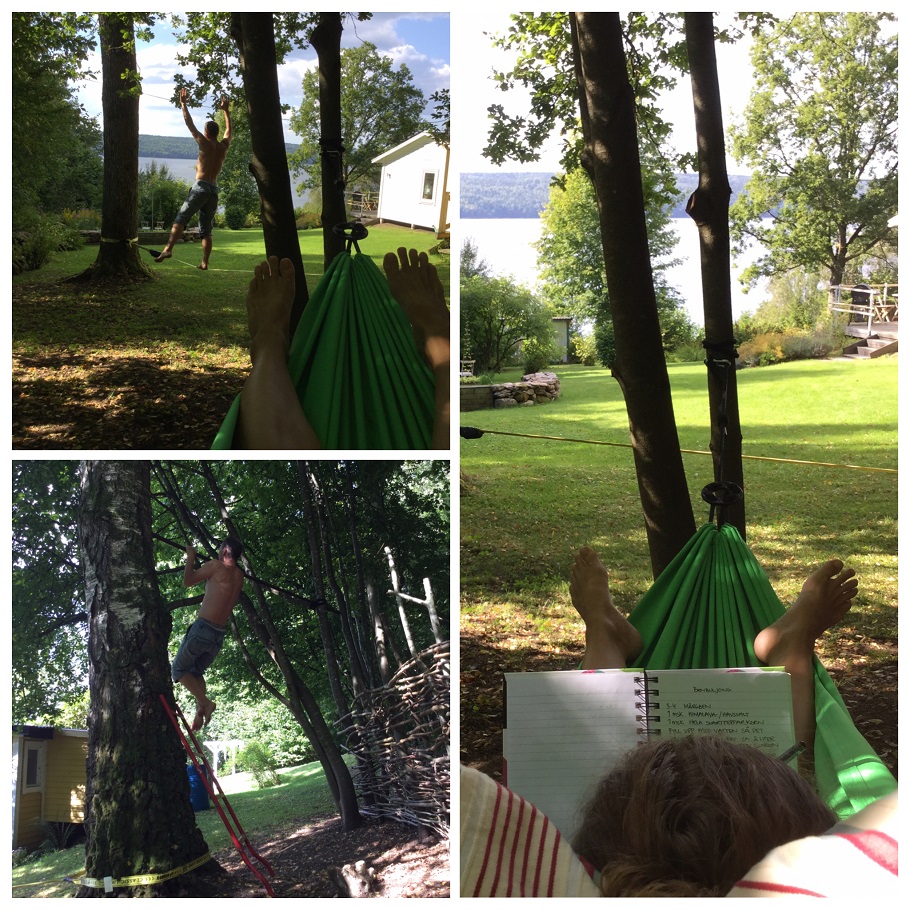 Vädret var underbart och vi vistades utomhus nästan hela dagen. Med en springtur och lek både på Slackline och ”Pull up bar” var det skönt att ligga i hängmattan emellanåt och bara ta igen sig, skriva lite och njuta av utsikten. Och sedan upp igen och leka!