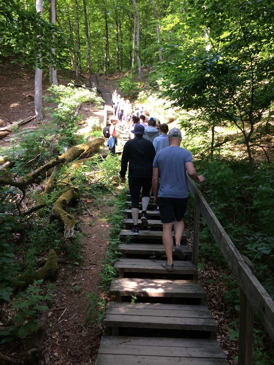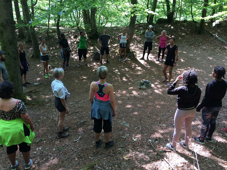 Dagen började med mingelkaffe och lite genomgång, därefter styrde Åsa deltagarna upp för en lång trapp och in i bokskogen för naturlig rörelse.