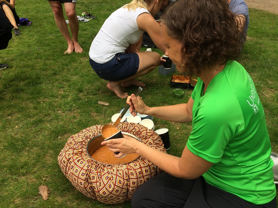 Efter omkring två timmar med olika rörelser var det dags för lunch, deltagarna serverades Köttfärssoppa som varmhölls i fina Wonderbag.
