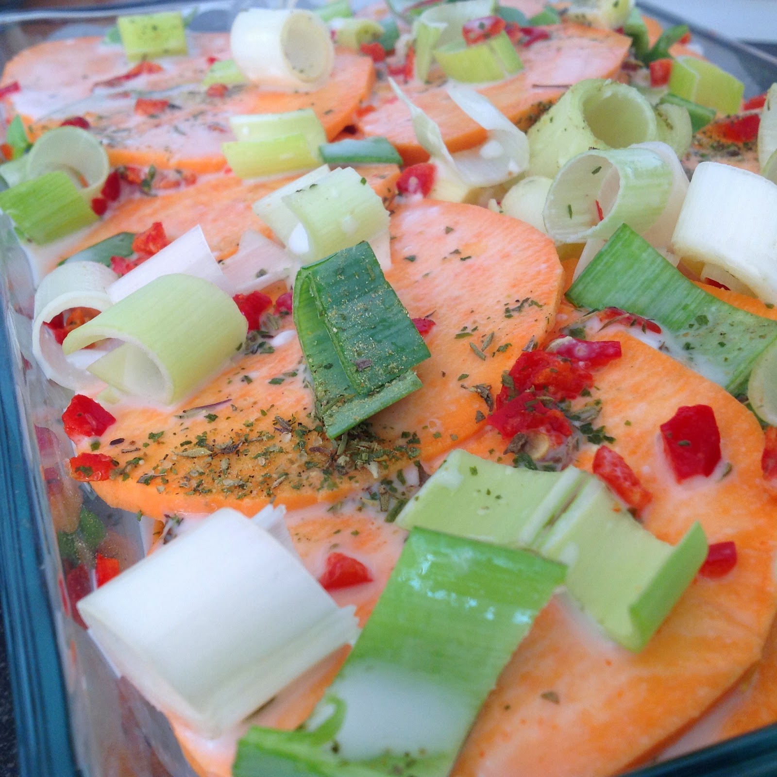 För recept och hur du går tillväga titta in i Paleoskafferiet. Länk till Sötpotatisgratäng med vitlök, chili och purjolök finns här.