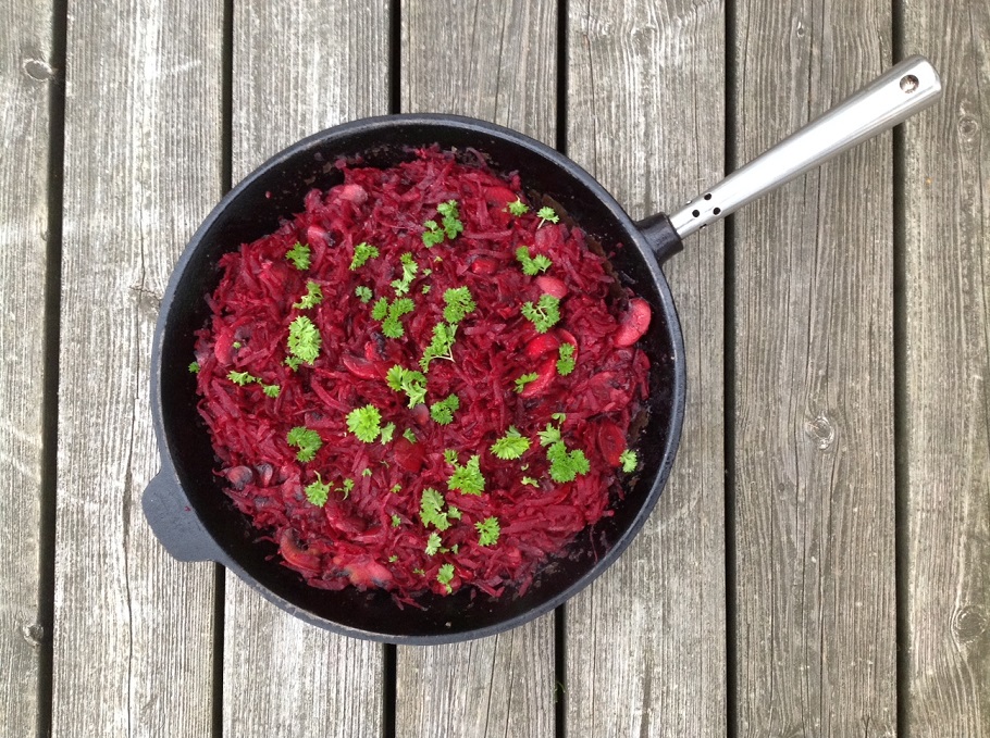 Från vår läsare Merlene har vi fått detta fantastiska och enkla recept på stekta rödbetor med vitlök och champinjoner! Helt underbart gott som tillbehör till både kött, fisk och kyckling. Vi åt dem tillsammans med hemmagjorda hamburgare och kokt broccoli.